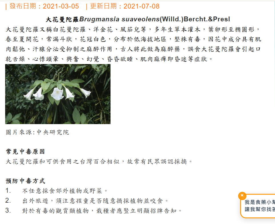 前揭函文指出,該署近期接獲通報民眾於野外自行採摘誤食大花曼陀羅葉片致中毒事件,為防範憾事再發,爰提供大花曼陀羅宣導文宣;
